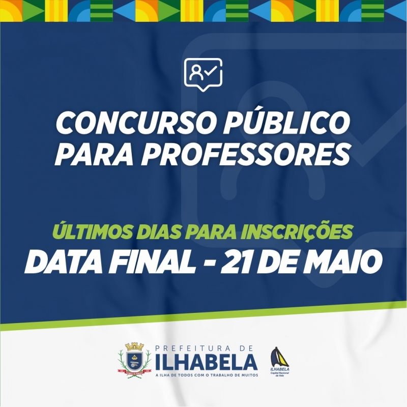 A Prefeitura de Ilhabela informa que as inscrições para o Concurso Público destinado ao provimento de vagas para os cargos de Professor de Educação Básica I (PEB I) — Anos Iniciais, Educação Inclusiva e Educação Infantil — estarão abertas apenas até o dia 21 de maio de 2024.
