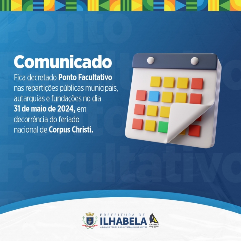 A Prefeitura de Ilhabela divulgou, nesta quarta-feira (22), que terá ponto facultativo nas repartições públicas municipais, autarquias e fundações no dia 31 de maio, em decorrência do Feriado Nacional de Corpus Christi.