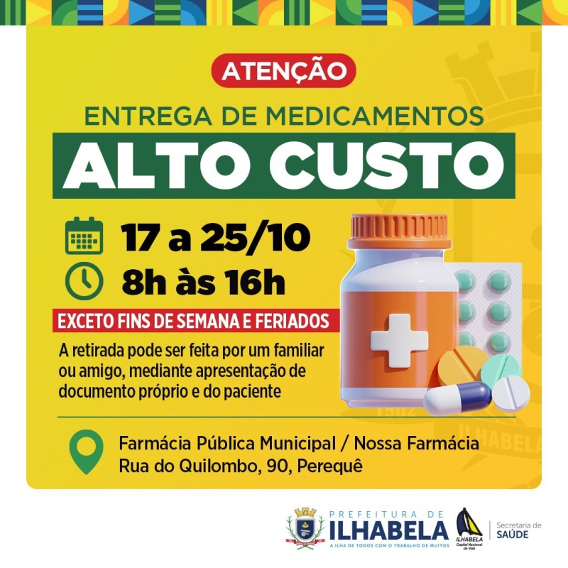 A Prefeitura de Ilhabela informa que os medicamentos de Alto Custo referentes ao mês de outubro estarão disponíveis para retirada na Farmácia Pública Municipal “Nossa Farmácia”, localizada na Rua do Quilombo, 90 – Perequê, até o dia 25 de outubro.