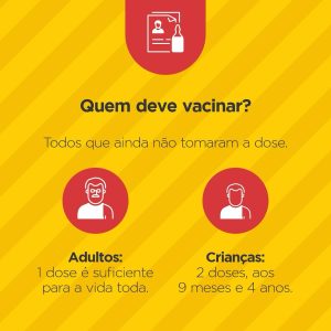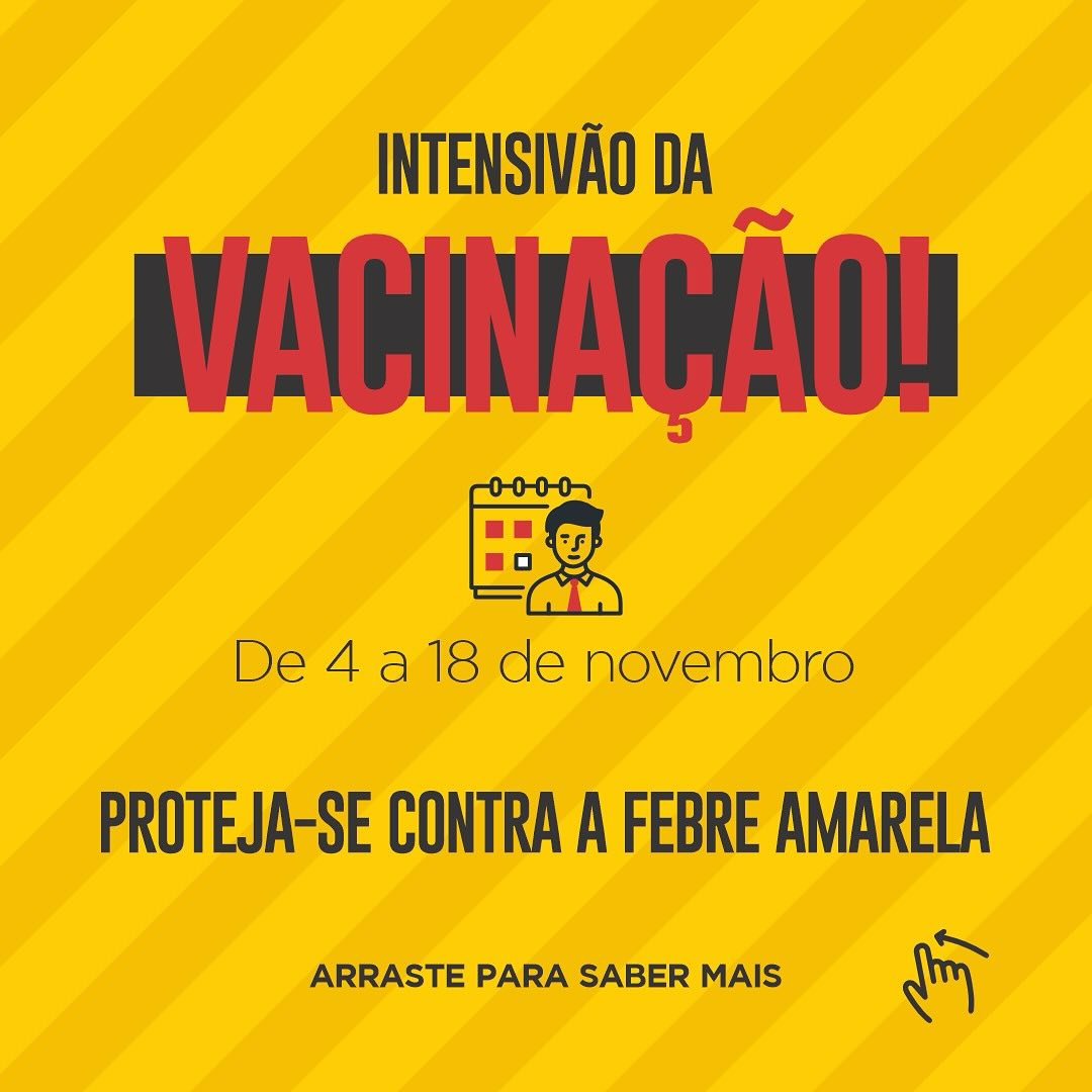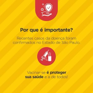 Entre os dias 04 e 18 de novembro, vamos intensificar a campanha de vacinação contra a febre amarela. Essa ação é essencial diante dos casos confirmados da doença em São Paulo e visa a proteger nossa comunidade e visitantes.