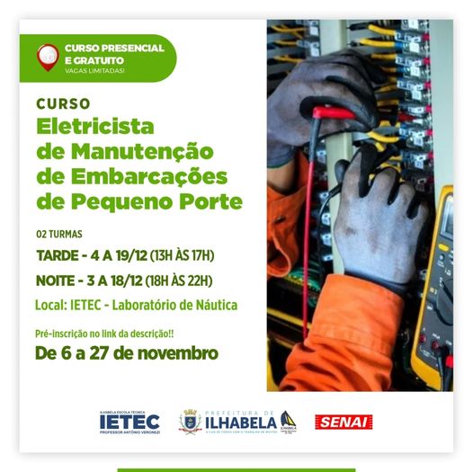 A Prefeitura de Ilhabela, por meio da Secretaria de Desenvolvimento Econômico e Turismo, em parceria com a Ilhabela Escola Técnica (IETEC) e SENAI, inicia o período de pré-inscrições para o curso presencial “Eletricista de Manutenção de Embarcações de Pequeno Porte” a partir desta quarta-feira (6).