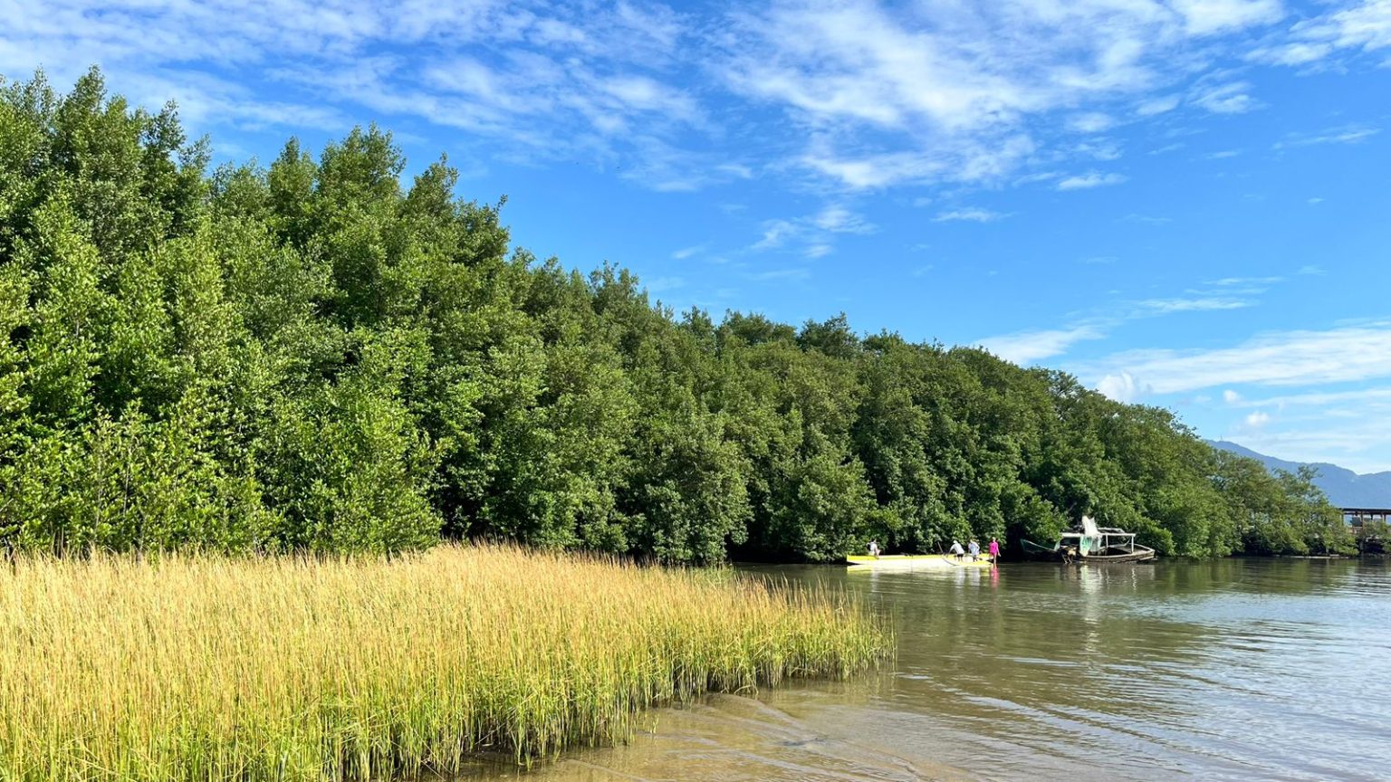 9h Concentração, hidratação, alongamento, sensibilização , palestra e introdução sobre o tema do lixo marinho, no mangue do lado da balsa de Ilhabela.