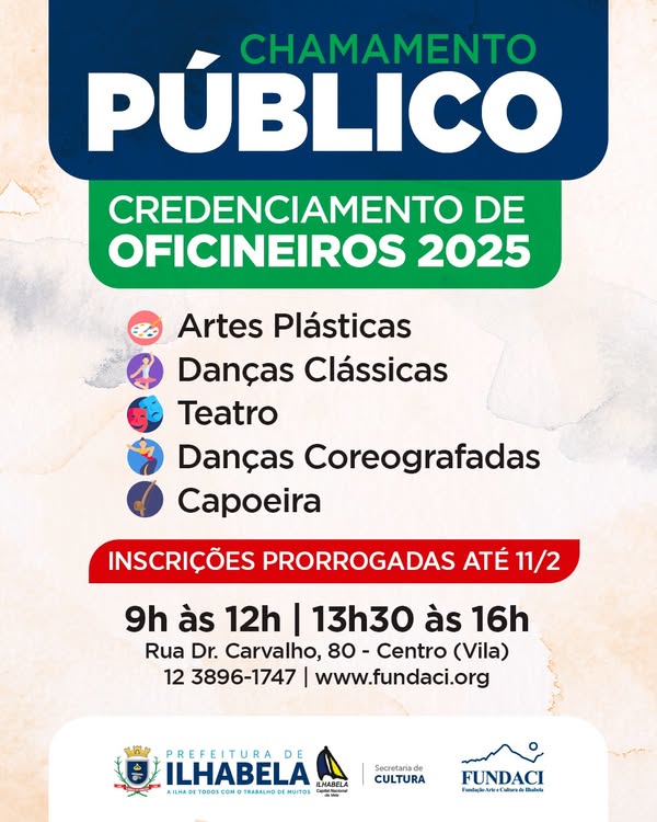 A Fundação Arte e Cultura de Ilhabela (Fundaci) prorrogou o credenciamento de oficineiros para as Oficinas Culturais de Artes Plásticas, Danças Clássicas, Teatro, Danças Coreografadas e Capoeira até HOJE (11).